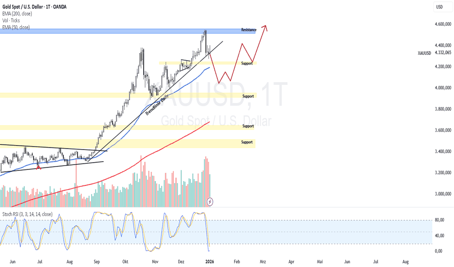 XAU/USD – Aufwärtstrend | Kauf bei KursrückgängenKursstruktur: Der Kurs reagierte stark auf die Unterstützungszone von 4.270 – 4.280 und bildete nach der Korrekturphase ein klares Ablehnungsmuster. Die aktuelle Struktur deutet darauf hin, dass die Korrektur wahrscheinlich abgeschlossen ist.