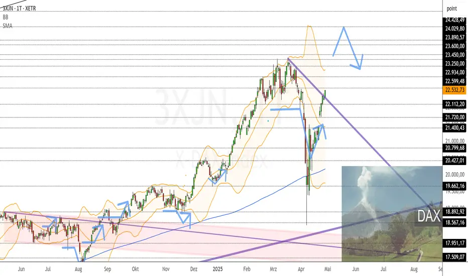 Da wir aber nun außerhalb des Abwärtstrends auf Tagesebene notieren, sollte man auch oben gut aufpassen, ob unser Dax aus dem Bewegungsverhalten ausbricht. Sollte der nämlich nun anfangen die neu erreichten Ziele nicht mehr abzuverkaufen und wieder Trenddynamik aufzubauen, wären oben 22660 und 22800 locker direkt noch erreichbar. Er müsste dafür eigentlich sogar nur die 22500 verteidigen und sich dort von oben kommend direkt wieder aufrichten und weiter machen oben. Die Scheine bleiben gleich. Für Aufwärtsstrecken der JT7U4K KO 18000 sowie GQ8FG8KO 16500 und für Abwärtsstrecken der MG510S KO 23920.