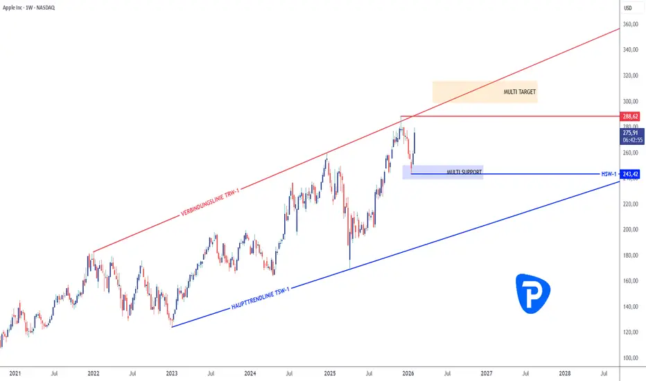 herzlich Willkommen zu einem kompakten Update zu APPLE INC (AAPL.US_24 CFD) von Pepperstone. Ich analysiere die Aktie auf Nasdaq (regular session) im Wochenchart.