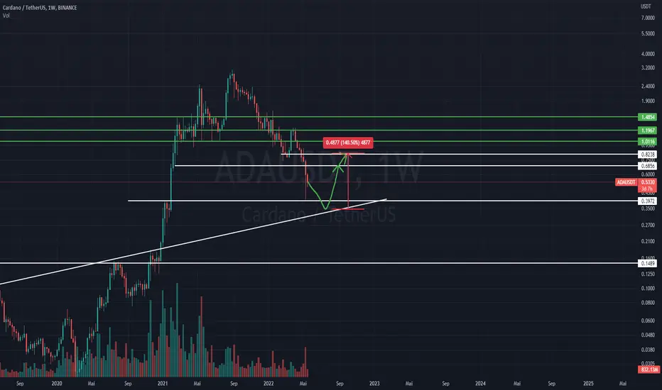 Im Wochenchart können wir erkennen, dass der Cardano Kurs schon bald an einer starken Unterstützungstrendlinie angekommen ist. Da diese noch nicht getestet wurde, gehen wir davon aus, dass der Kurs als Nächstes erneut auf die Unterstützung von $0,40 fallen wird. Eventuell könnte es noch einen Docht auf die Unterstützungstrendlinie geben, um diese als Unterstützung anzusehen. Danach könnte der Cardano Kurs allerdings etwas ansteigen. Ein Kursgewinn von über 100% ist nicht auszuschließen.