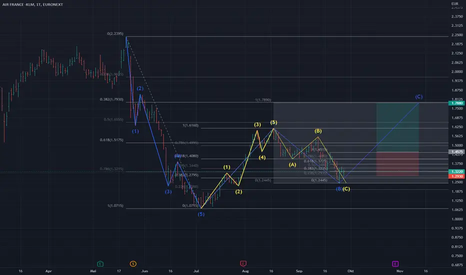 Hier ein Trade auf Air-France im Tageschart. Ziel des Trades ist das mögliche Korrekturende der großen Abwärtsbewegung (blaues C).