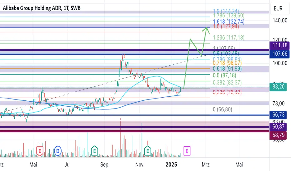 Die Alibaba ADR zeigt auf den höheren Zeiteinheiten erste Anzeichen einer Bodenbildung, während der Tageschart bereits einen Aufwärtstrend etabliert hat. Entscheidend ist der Bruch des tieferen Hochs bei 111,18 €, um eine neue bullische Bewegung zu bestätigen.