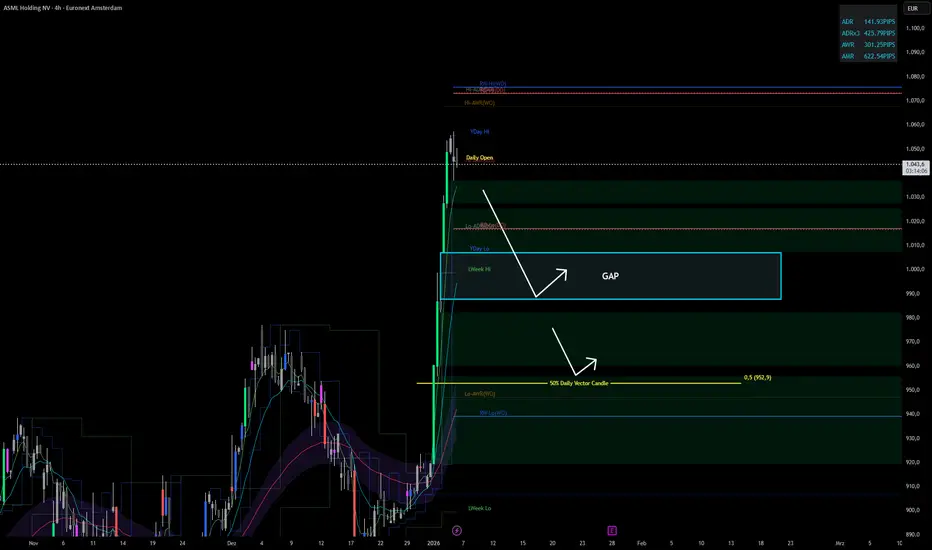 ASML ist seit Freitag stark von ca. 920 USD auf rund 1050 USD angestiegen, ohne einen nennenswerten Pullback. Zwischen Freitag und Montag ist zudem eine GAP entstanden, die bislang offen ist.