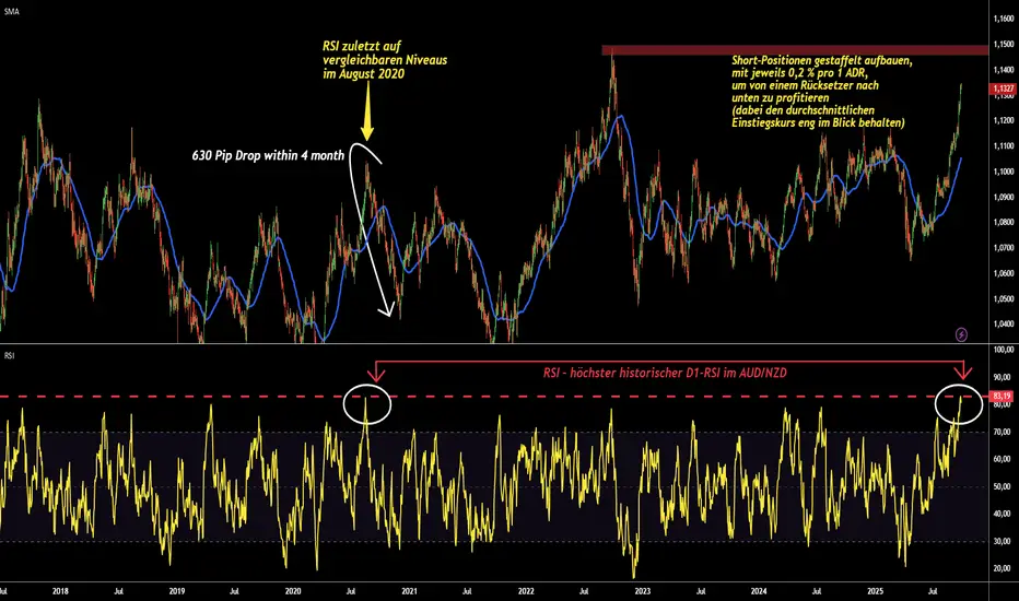 Der AUD/NZD D1 RSI notiert aktuell auf dem höchsten Tagesniveau aller Zeiten. Ein vergleichbares Szenario gab es nur einmal – im August 2020. Damals folgte innerhalb der nächsten 4 Monate ein Rückgang von 630 Pips.