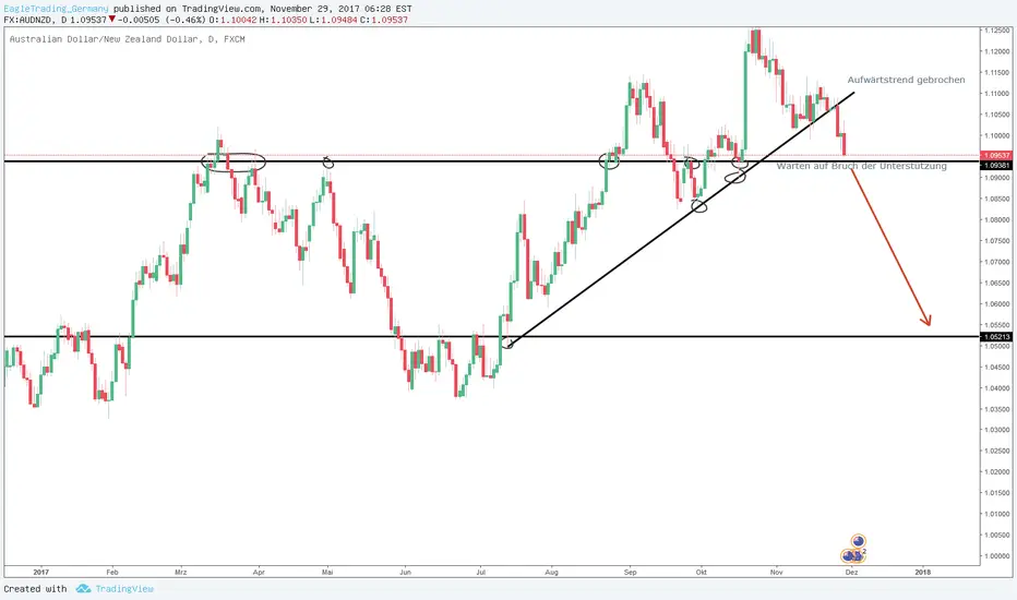Shortpotential im Währungspaar AUDNZD wurde mit Bruch des Aufwärtstrends freigeschalten. Es ist ein Bruch der nächsten Unterstzützung abzuwarten im Bereich 1.09400 / 1.09300 um weiteren Raum nach unten zu öffnen.