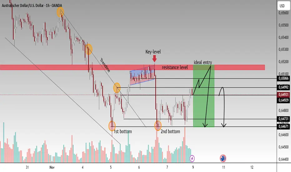 Wenn der Kurs über 0.6510 ausbricht und schließt, könnte dies eine bullishe Umkehr bestätigen, mit Zielen im Bereich von 0.6540–0.6560.