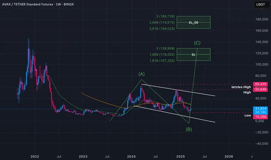 Hier mal eine Analyse die von einem Follower Gewünscht wurde. Wir sehen hier AVAX in der Wochenansicht. Aktuell gibt es hier noch wenig Struktur weshalb ich hier mehr Spekulieren muss mit dem was mir der Chart her gibt. Wir sehen zuerst einmal, das wir in einem Abwärtstrend verlaufen und dieser erst ab der Marke von 65.435$ gebrochen ist. Nehmen wir jetzt einmal an, das wir mit dem Lowpunkt auch das Lokale Tief drin haben. So würden wir mit dem Überwinden der Marke von 65.435$ eine Bullische Strucktur aufbauen welche seine Zielzonen in den beiden grünen Boxen über uns hätte. Die Zielbox (ZL) ist ein Konservatives Ziel für den Bullrun. Eskaliert der Markt könnten wir die Überextention (ZL_ÜE) erreichen. Gibt es eine totale Extension könnten wir noch eine dritte Box hinzufügen, jedoch Orientiere ich mich erst einmal an den beiden vorhandenen Zielzonen. Wie könnte man jetzt hier weiter vorgehen? Ich persönlich würde langsam aber stetig mit DCA (Dollar Cost Averaging) mich in den Markt einkaufen. Wir könnten bei AVAX den Boden gesehen haben, jedoch haben wir auch noch die unter uns liegende Diagonale die man nicht Übersehen sollte. Um weitere Einstiegsmöglichkeiten zu lokalisieren, müsste man sich weiter in den Chart hinein begeben und die Untergeordneten Timeframes Analysieren. Ich belasse es aber erst einmal bei dieser Groben Analyse. Bitte beachtet, meine Analyse ist nur eine Gedankenstütze und stellt kein Trading Steno dar welches man Blind Trade sollte. Ich kann und darf keine Kauf/ Tradeempfehlungen geben. Was ich hier Teile sind meine Analysen und wie ich mich im Markt bewege.