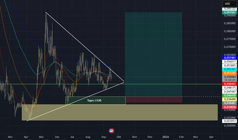 An der oberen Trendlinie abgewiesen. Als nächstes sehe ich eine Umkehr mit dem fallenden BTC und ETH nach den Rate Cuts und das erreichen des Ziels bei 0.0385$ für einen Long Swing Trade bei Brett