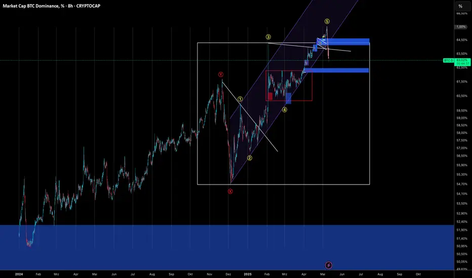 BTC.D hat den Ausbruch nach oben nicht geschafft somit fallen wir stärker was gut für BTC und besonders für die Altcoins ist bei 63,30% wird es ein kurzes stopp geben jedoch wird die BTC Dominanz diesmal kein halt geben und dann auf die 60% zu gehen dort wird es etwas schwieriger jedoch denke ich es wird einen retest geben nach oben bei den 62,30% dann fallen wir aber wieder stark bis zu den 54,50% und dann wird es interessant aber wenn es so weit ist melde ich mich nochmal.