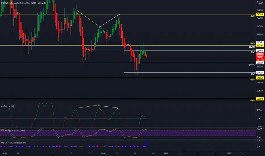 Es sieht so aus, als ob das lower high drin ist und dies jetzt unsere converging wave ( für Short ) ist. Außerdem haben wir den pdPOC und den POC der Range bei 32800 wieder verloren. Noch dazu sehen wir im Stochastic RSI, dass der 4 hr Trend an der Top angekommen ist. Immer wenn ein Chart austoppt, könnte sich ein Trend in die andere Richtung drehen.