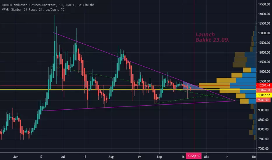 Ihr seht hier das große downward Triangle mit der vertikalen Bakkt Linie. Es wird spannend. Ich erwarte auch einen kurzen Downtrend danach einen Pump.