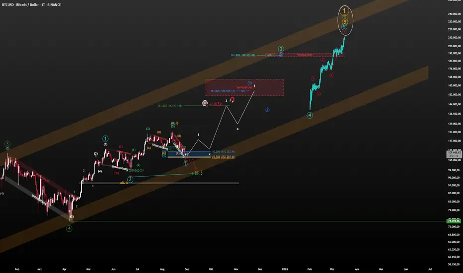 👉Die dunkelgrüne Fibo 💚 – die Primär-Fibo – geboren aus dem Low der grünen Welle 4 im April 2025 bei 74.393. Sie misst die Länge der dunkelgrünen Welle 5, die wiederum im "Legendären türkisen Welle 5" Count gezählt wird. (Seit April´25 hier bei TradingView)