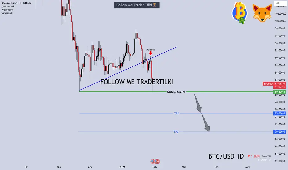 30 Ocak 2026 günü sizlerle paylaşmış olduğum Bitcoin analizimde, ''80,000'' dolar seviyesi altına düşerse ilk hedefimin ''75,000'' dolar olacağını söylemiştim.