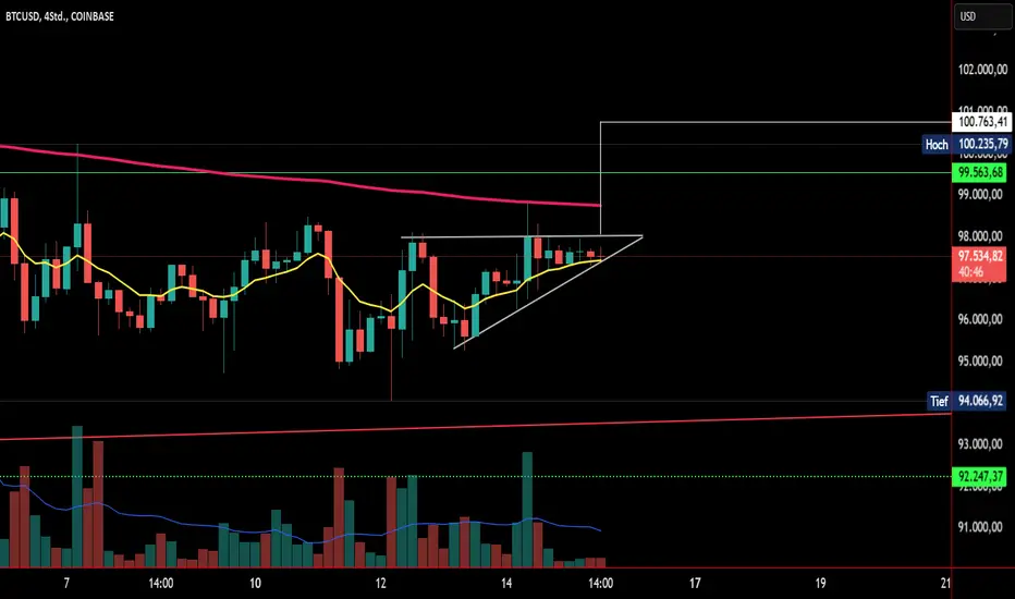 Bitcoin bildet auf dem 4-Stunden-Chart ein aufsteigendes Dreieck, was einen möglichen Ausbruch signalisiert. Der Preis erreicht höhere Tiefststände und zeigt starken Kaufdruck, während der Widerstand bei 98.000 USD bleibt.