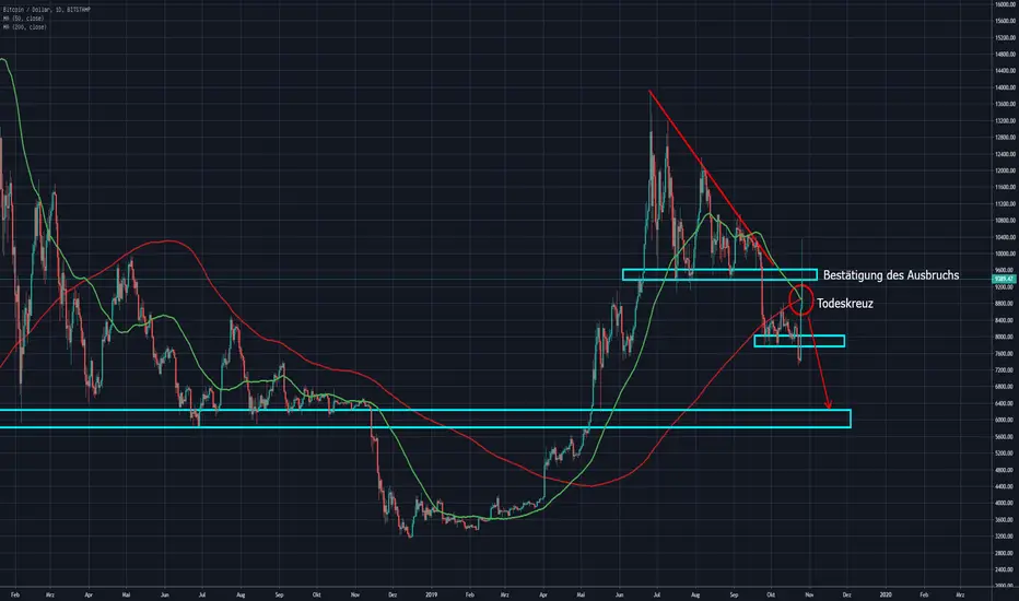 Sieht so aus, als würde der Bitcoin aktuell noch einmal einen letzten Push auf die 9500$ - 10.000$ Marke machen, um den Ausbruch aus dem fallenden Dreieck zu bestätigen. Es hat sich zudem ein weiteres Verkaufssignal, das Todeskreuz gebildet (50-Tages-Linie kreuzt 200-Tages-Linie nach unten)