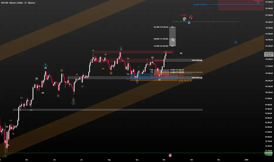 Kleines Update!Es könnte sein, dass Welle 3 kurz vorm 161,8%-Level bereits fertig gezuckt hat – mit rund 45 % EW-Wahrscheinlichkeit.