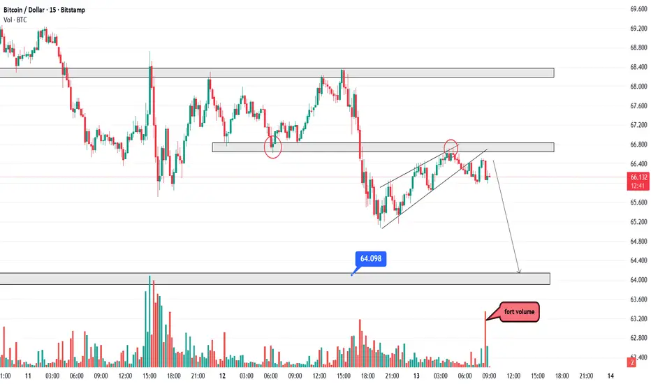 Bitcoin wird derzeit um 65.990 $ gehandelt, nachdem er klar unter dem wichtigen Widerstand bei 68.400 $ abgewiesen wurde. Die Struktur zeigt einen steigenden Keil, der gerade nach unten durchbrochen hat – ein typisch bärisches Signal.