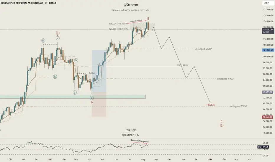 BTCUSD noch nach oben gehen kann. Meine Antwort bleibt: Die Luft wird dünn. Ohne eine größere Korrektur sehe ich nur begrenztes Potenzial. Worst-Case- oder Best-Case-Szenario, für manche eine super Opportunity und für manche der Untergang, könnte einen Rücksetzer von rund 40–42 % bringen – das würde uns in den Bereich um 66.000 $ führen.