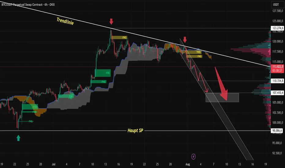 Der Preis bewegt sich nun deutlich in einem Abwärtstrendkanal, begleitet von mehreren offenen FVGs (Fair Value Gaps) oberhalb des aktuellen Niveaus – ein Zeichen dafür, dass das Angebot weiterhin dominiert. Auch das Volume Profile zeigt eine geringe Liquidität unterhalb von 110k, was Raum für weitere Rückgänge eröffnet.