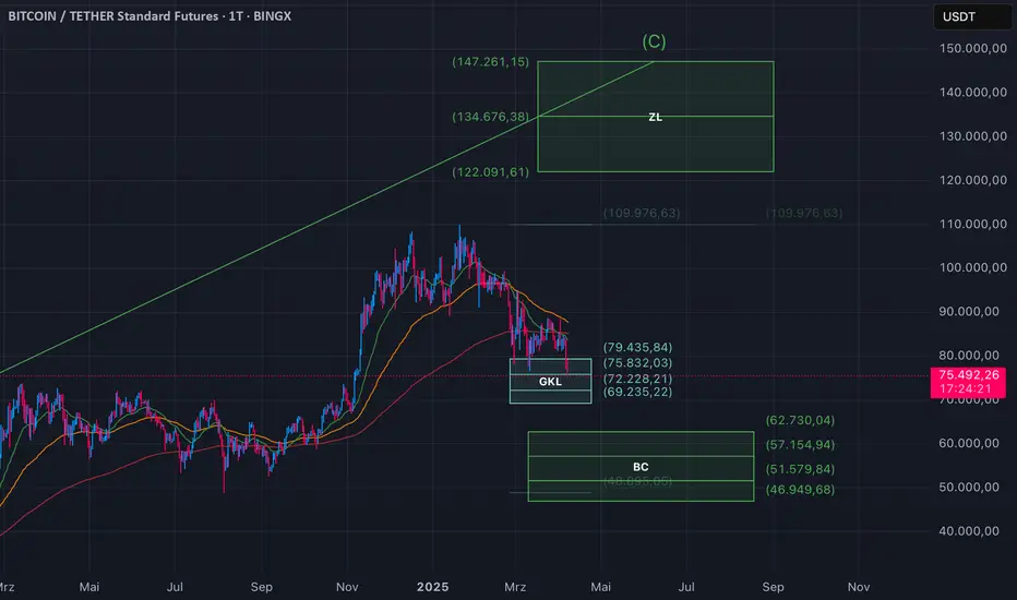 Über das Wochenende konnten wir am Kryptomarkt einen Abverkauf sehen. Aktuell stehen wir im GKL der letzten Aufwärtsbewegung welcher uns erst einmal Support geben sollte und eine mögliche Trendwende einleiten könnte. Hält uns das GKL nicht und wir fallen weiter, dann müssen wir ganz stark davon ausgehen, das es noch bis in das BC Korrekturlevel geht. Wir müssen dieses Szenario im Blick behalten und dürfen dieses nicht Ignorieren. Wir sollten aber auch bedenken, selbst bei einem erreichen der BC Box ist die Bullische Struktur noch nicht gebrochen. Wir verlaufen in der grünen Sequenz und deren erster Zielbereich ist die grüne Zielzone (ZL) über uns. Aktuell macht es keinen Sinn in den kleineren Time Frames nach einstiegen zu suchen.