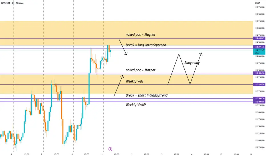 In der unteren Zone befindet sich eine Menge Unterstützung. Wir haben bei 113.400 den POC von gestern, der gerne als Magnet gesehen wird, da er den Preis oft dorthin zurückzieht, um zu prüfen, ob der Preis noch „in Value“ ist. Bei 113k liegt der Wochen-Überwert-Bereich und bei 112.500/112.400 der Unterwert-Bereich von gestern sowie der Wochen-VWAP. An beiden Zonen dürfen wir also mit guten Ablehnungen rechnen.