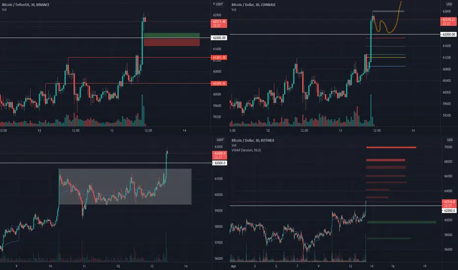 Jetzt wird es interessant zu beobachten, ob er die 62k Bestätigen kann und weiter Richtung 63k marschiert, oder das nur ein Fakeout aus der Range war.