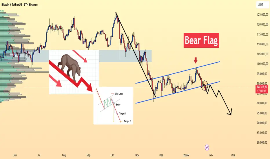 Aus technischer Sicht hat BTCUSDT zuvor eine starke Abwärtsbewegung erlebt, gefolgt von einer schwachen Erholung, wodurch sich auf höheren Zeiteinheiten eine Bear-Flag-Struktur gebildet hat. Dieses Muster gilt als klassisches bärisches Fortsetzungsmodell. Solange der Kurs am oberen Rand des Kanals abgewiesen wird, behalten die Verkäufer die Kontrolle und weiteres Abwärtspotenzial in Richtung tieferer Liquiditätszonen bleibt bestehen.