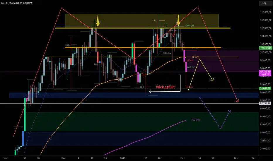 Wie bereits am Freitag angenommen, hat BTC es an der gelben Widerstandslinie nicht leicht und wurde abverkauf, während der Support bei 102K hätte halten müssenund leider auch gebrochen wurde. Nun wurde die Wick zur 50er Daily EMA gefüllt, und nun konnte auch diese keine ausreichende Unterstützung mehr bieten, wird mit großer Wahrscheinlichkeit die nächste Wick ebenfalls gefüllt – wie im Chart ersichtlich. In den letzten Wochen hat Bitcoin immer wieder seine Wicks auf dem Daily-Chart vollständig ausgefüllt, was dieses Szenario weiter untermauert.