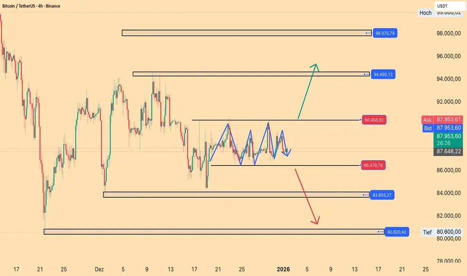 Bitcoin konsolidiert aktuell in einer klar definierten Spanne. Käufer und Verkäufer halten sich die Waage, was zu Marktunsicherheit führt. Der Kurs bewegt sich um die obere und untere Grenze dieser Spanne und ist daher ein entscheidender Bereich für Handelsentscheidungen.