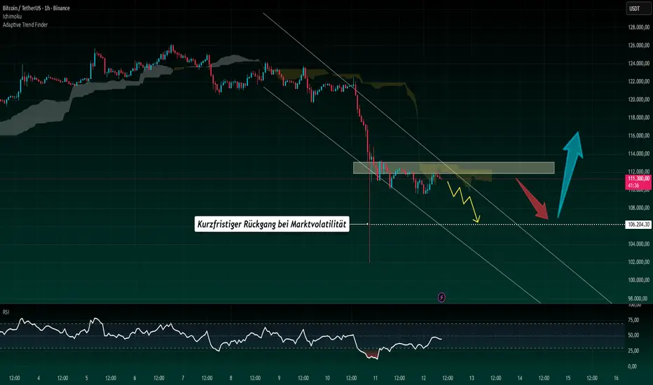 Bitcoin pendelt nach einem starken Rückgang von 130.000 USDT um die 111.200 USDT-Marke. Der Kurs befindet sich weiterhin im Abwärtstrendkanal und unterhalb der Ichimoku-Wolke, was auf einen weiterhin abwärtsgerichteten Kurzzeittrend hindeutet. Der Bereich von 111.500–112.000 USDT stellt einen starken Widerstand dar, während der alte FVG-Bereich erneut Verkaufsdruck auslösen kann.