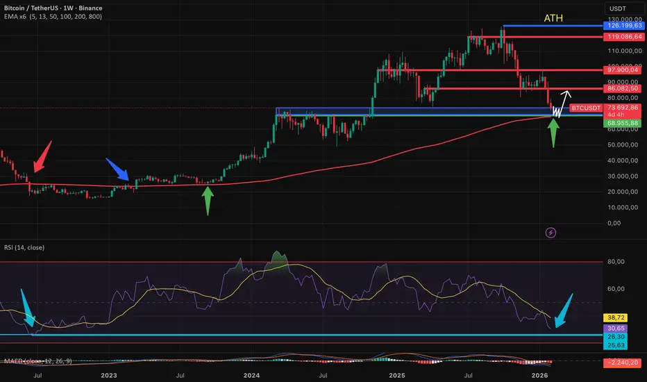 Besonders interessant ist der Abstand zur 200-Wochen-EMA, der aktuell nur noch rund 4.000 USD beträgt. Historisch betrachtet ist diese Linie von enormer Bedeutung. Nach dem Bruch im Jahr 2022 konsolidierte Bitcoin über viele Monate hinweg unter hoher Unsicherheit, bevor 2023 der nachhaltige Ausbruch folgte. Der anschließende Retest der 200-Wochen-EMA als Support markierte den Beginn des gesamten Aufwärtszyklus bis zum aktuellen Allzeithoch.