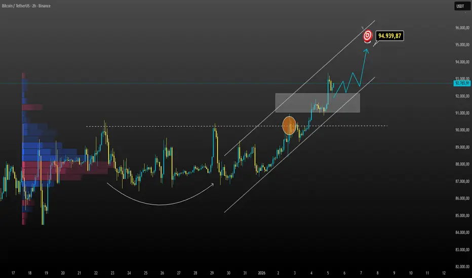Struktur: BTCUSDT setzt seinen klaren Aufwärtstrend innerhalb seines aufsteigenden Preiskorridors fort. Nach einer Konsolidierungsphase mit abgerundeter Basis hat der Kurs die Gleichgewichtszone durchbrochen und testet aktuell den Ausbruchsbereich darüber erneut. Dies deutet darauf hin, dass der Kaufdruck weiterhin die Struktur bestimmt.