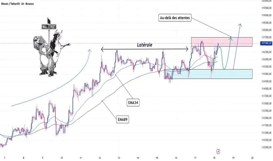 La paire BTC/USDT accumule autour de 117 000 points après avoir rebondi depuis le support des 115 000 points. La zone de demande de 115 000 à 115,5 000 points a été retestée à plusieurs reprises et les MME 34 à MME 89 continuent d'agir comme un support dynamique, consolidant la tendance haussière.