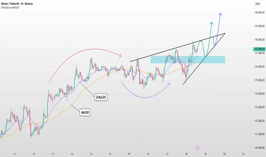 O Bitcoin está sendo negociado em torno de 117.200, mantendo o momento da recuperação depois de ser fortemente afastado da área de apoio de 116.500. No quadro 1H, o preço formou o modelo de cunha crescente com um aumento na tendência de manutenção. O EMA20 foi cortado no MA50, mostrando que a força de compra está dominando.