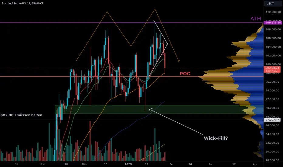 Ein weiteres kritisches Szenario ergibt sich, wenn die 50-Tage-EMA bricht und die blaue Support-Zone keinen Halt bietet. Dies könnte die sogenannte „Neckline“ eines großen M-Patterns darstellen. Sollte dieser Bereich ebenfalls keinen ausreichenden Support liefern, könnte ein weiterer Kursrückgang folgen.