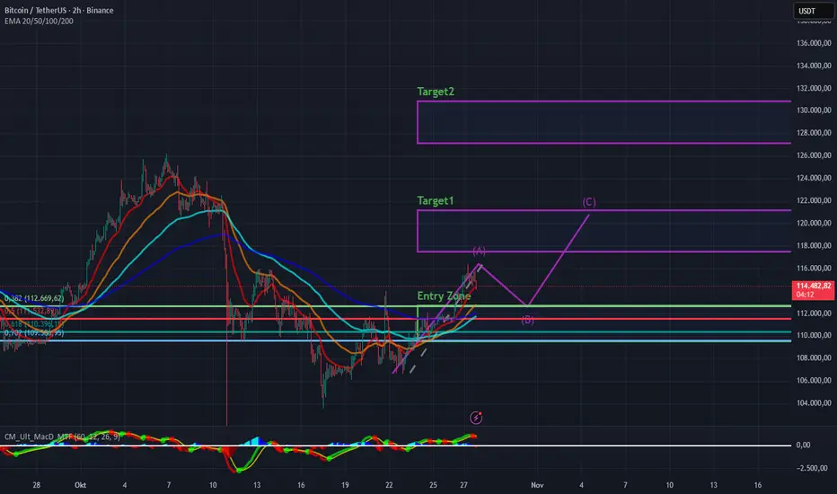 Aktuell sehen wir nach dem starken Anstieg aus der Entry Zone (111–113k) den Abschluss der ersten Welle (A). Der Markt könnte nun eine saubere ABC-Korrektur formen, bevor der nächste Aufwärtsimpuls startet.