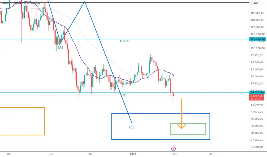 Schauen wir uns das große Ganze an: Ich habe euch im Chart ein blaues Rechteck eingezeichnet. Das ist unsere primäre Kaufzone, die sich massiv zwischen 77.000 USD und 67.600 USD erstreckt.