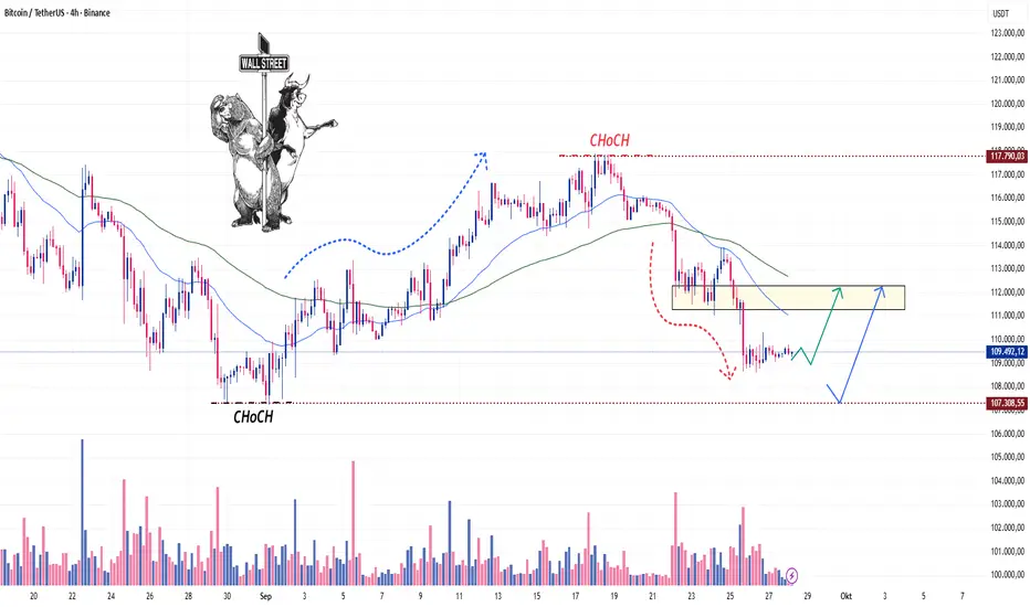 Nach dem jüngsten starken Rückgang hat Bitcoin eine Pause eingelegt und sich bei etwa 109.000 angesammelt. Auf dem 4H-Chart gab es zwei CHoCH-Ereignisse (Change of Character), die auf einen Richtungswechsel der Marktkräfte und die Möglichkeit einer Erholungswelle hindeuten.