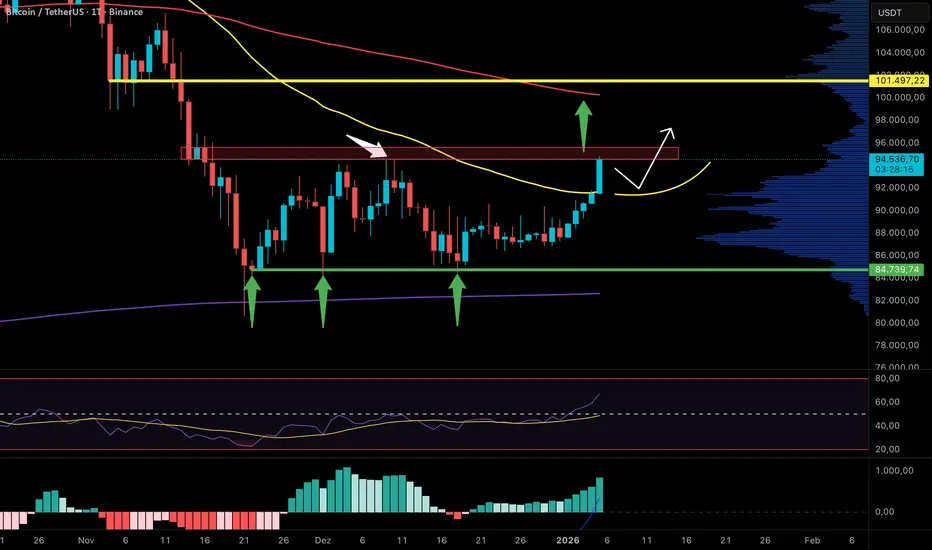 Sollte es Bitcoin jedoch gelingen, diese rote Widerstandszone sauber nach oben zu durchbrechen, eröffnet sich ein sehr attraktives Szenario: