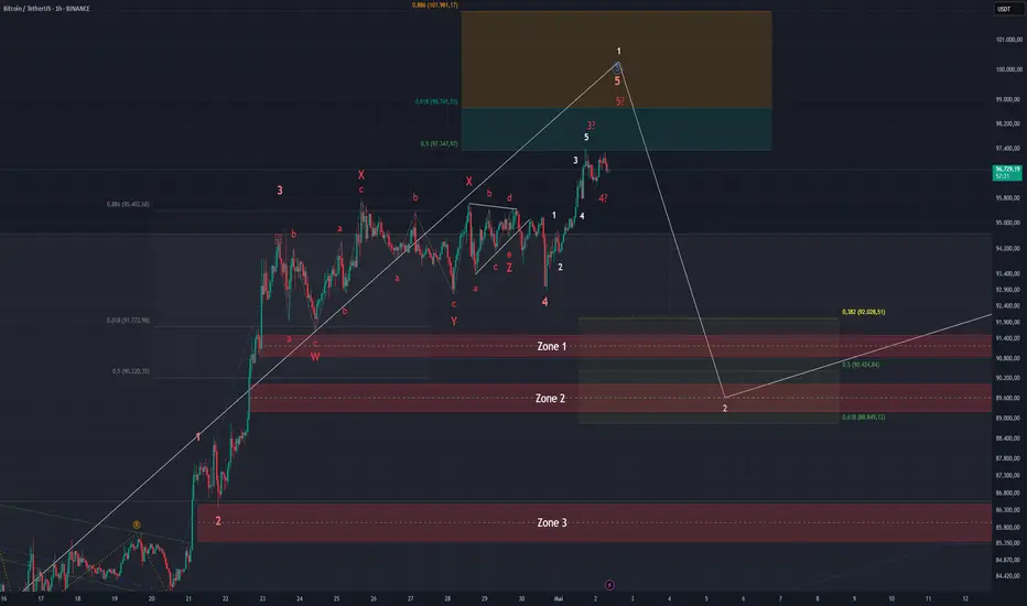 Die Welle 5 der aktuellen Aufwärtsbewegung hat nun präzise die angestrebte Zielzone erreicht. Bemerkenswert ist dabei, dass das Hoch der Welle exakt die Mindestzielzone berührt, die ich für diese finale Wellenbewegung definiert habe. Dennoch wirft die vergleichsweise kurze Ausdehnung der vorgelagerten Welle 4 (in Weiß markiert) gewisse Zweifel an der finalen Vollendung der übergeordneten Welle 5 auf. Aus diesem Grund besteht die Möglichkeit, dass mit dem Erreichen der aktuellen Zielzone zunächst lediglich die rote Welle 3? abgeschlossen wurde. In diesem Szenario wäre ein weiteres, moderat höheres Hoch – als tatsächliche rote Welle 5? – denkbar, welches in der Region um 98.700 USD zu erwarten wäre.