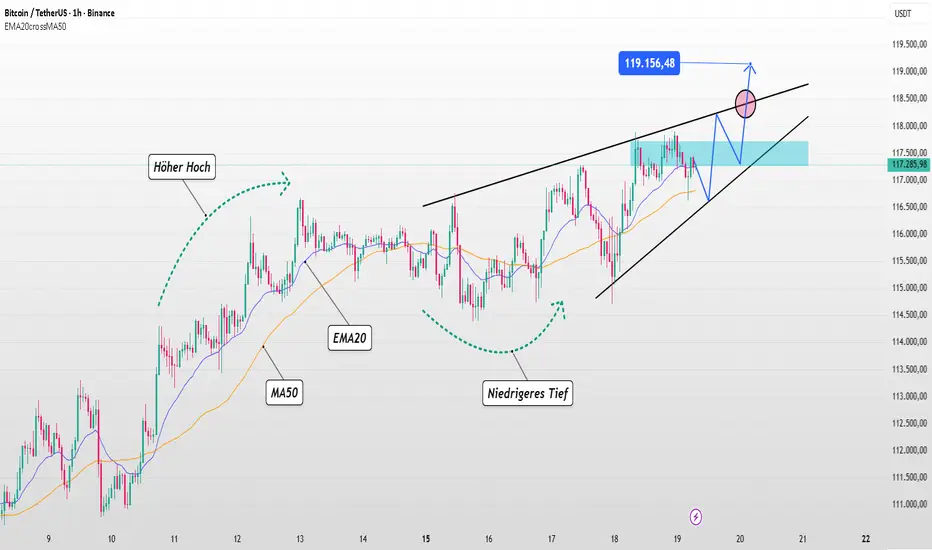 BTC bewegt sich in einem aufsteigenden Keilmuster, wobei die Unterstützung bei 117.500 Punkten hält. Der EMA20 liegt über dem MA50, was darauf hindeutet, dass der kurzfristige Trend weiterhin bullisch ist. Das Hauptszenario ist ein erneuter Test der Unterstützungszone und anschließender Anstieg in Richtung 119.000–119.100 Punkte.