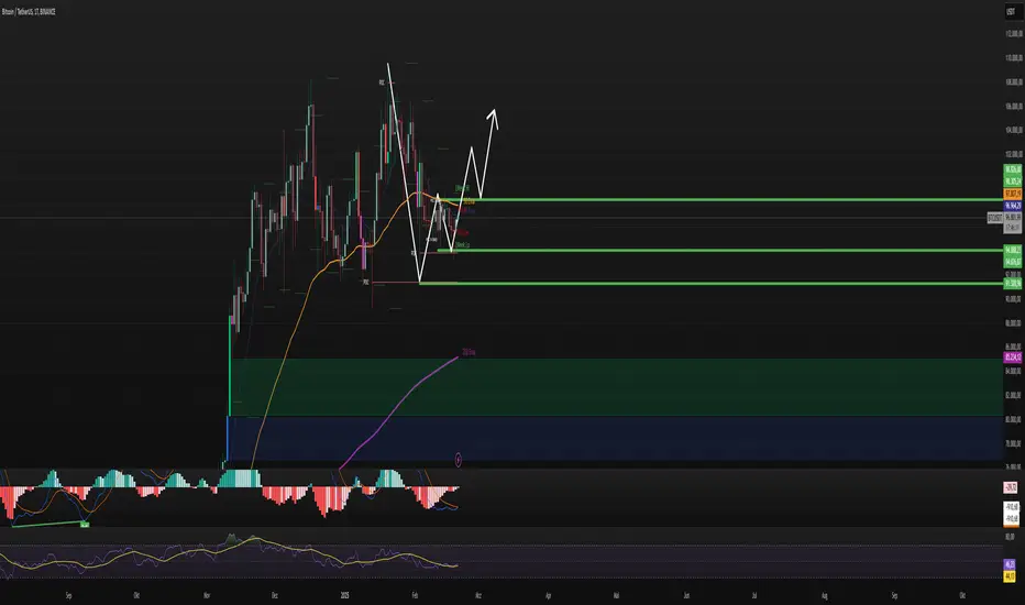 Sieht garnicht so schlecht aus auf dem Tageschart, noch können wir einem großen double Top entgehen. 2 positive Tagescandles zeigen einen Aufschwung. Jetzt kommt es drauf an, BTC muss Nachhaltig die 50er EMA nach oben brechen um einen weiteren Anstieg zu bestätigen. Sollte das diese Woche nicht gelingen, geht es nochmal eine Etage tiefer in Richtung 89-85k. Ob das dann halten kann oder wir die Liquidität bei 70k abholen. Es bleibt spannend...