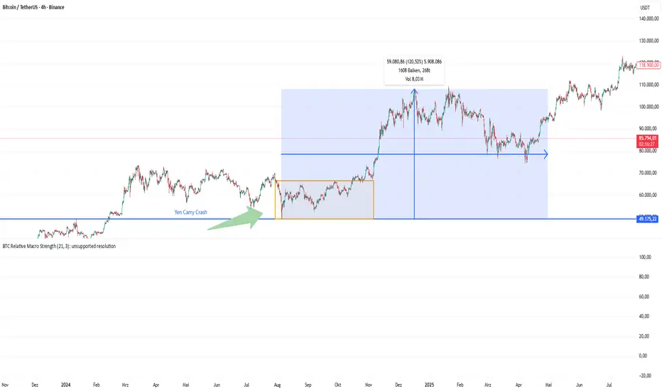 Der Yen Carry Crash 2024 führte zu einem deutlichen Einbruch bei Bitcoin, ausgelöst durch die plötzliche Entflechtung des Yen-Carry-Trades nach der Zinserhöhung der Bank of Japan. Doch die anschließende Entwicklung zeigt, dass solche Makro-Schocks nicht zwingend das Ende eines Zyklus bedeuten: Vom Tiefpunkt erholte sich BTC um über 120 %, was eine massive Trendwende markierte. Die Lehre für heute: In Phasen erhöhter Zins- und Liquiditätsrisiken sind kurzfristige Korrekturen möglich, aber historische Muster sprechen dafür, dass nach Bereinigungen oft neue Aufwärtsbewegungen entstehen. Vorsicht ja – Panik nein.