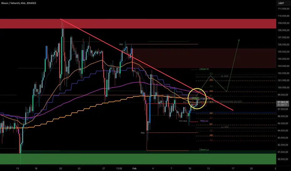 • Sollte BTC es über die 102K schaffen und die gelbe Widerstandslinie hinter sich lassen, dann ist die Wahrscheinlichkeit groß, dass Bitcoin die rote Vector-Kerze bis 106K abholt.