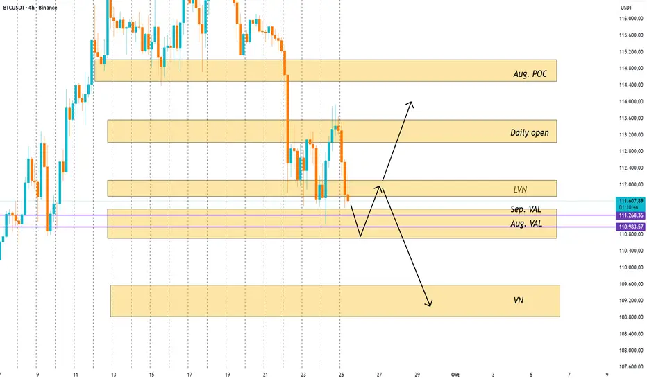 1) Der POC der gesamten Bewegung, also von Montag bis heute, befindet sich über uns, aktuell bei exakt 112.720. Das bedeutet, dass das meiste Volumen dort oben gehandelt wurde. Was sagt uns das? Höchstwahrscheinlich hat Retail dort massiv gekauft, während die OTFs ihre Positionen abgeworfen haben. Meiner Meinung nach würde es keinen Sinn ergeben, dass die großen Spieler sich dort oben eindecken oder ihre Shorts liquidieren.