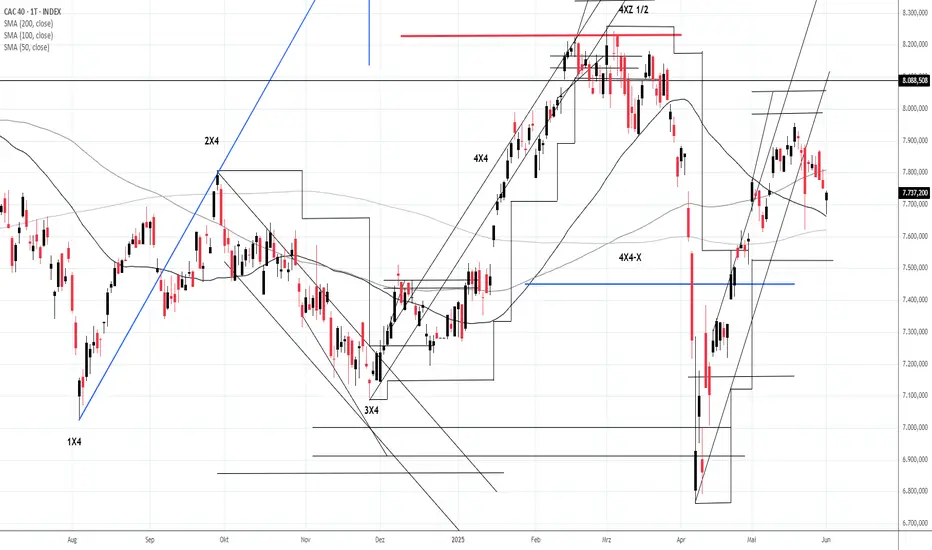 Aufgrund eines X-Sequentials X4 Kursmusters aus dem Spätsommer 2024 stieg der CAC 40 Index bis zum 3.3.2025 auf 8.257,880 Punkte an. Mit diesem Hochpunkt wurde nur die Hälfte des regulären Aufwärtsziels erreicht und der CAC 40 Index ging anschließend in eine Topbildung über. Infolge einer Übertreibung fiel der Index bis zum 7.4.2025 auf 6.763,760 Punkte.