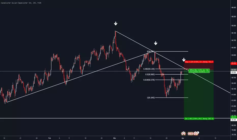 Nach dem das Retracement zum 0,38er Fiblevel so gut wie beendet ist, gehe ich mit dieser Position den erwarteten Shortmove ein.