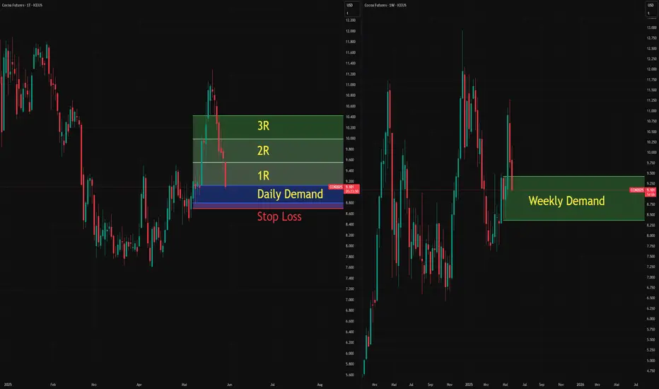 Kakao befindet sich aktuell in einer starken Demand-Zone, sichtbar sowohl im Weekly- als auch im Daily-Chart.