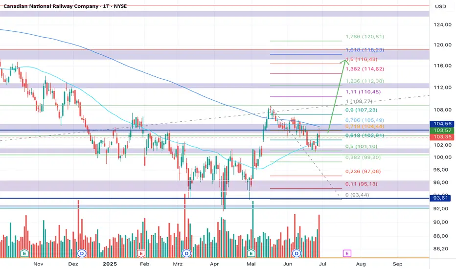 CNR legte einen bullischen Impuls bis rund 108,64 USD hin. Seitdem konsolidiert die Aktie in einer ABC-Korrektur, die sich bisher in zwei Wellen vollzieht. Aktuell sehen wir am 0.5er Fibonacci-Retracement bei 100,81 USD deutliches Kaufinteresse. Am Donnerstag bildete sich zudem ein bullish engulfing candle – ein erstes technisches Signal für eine mögliche Trendumkehr innerhalb der Korrektur.