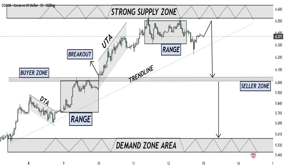 COCOAUSD — Angebotsablehnung, Trendlinienbruch & Bärisches Fortsetzungs-Setup
